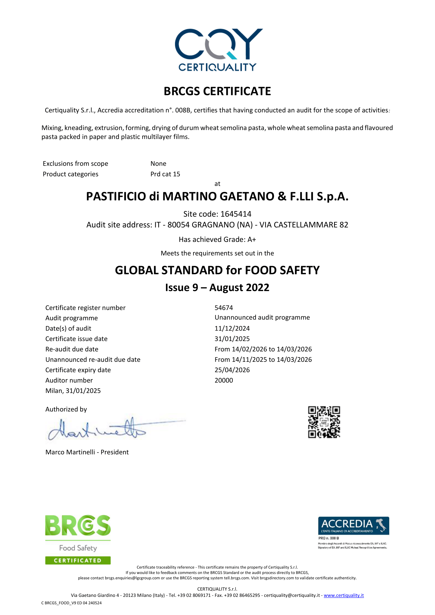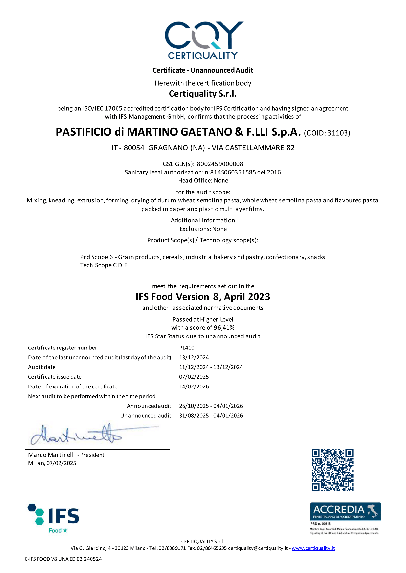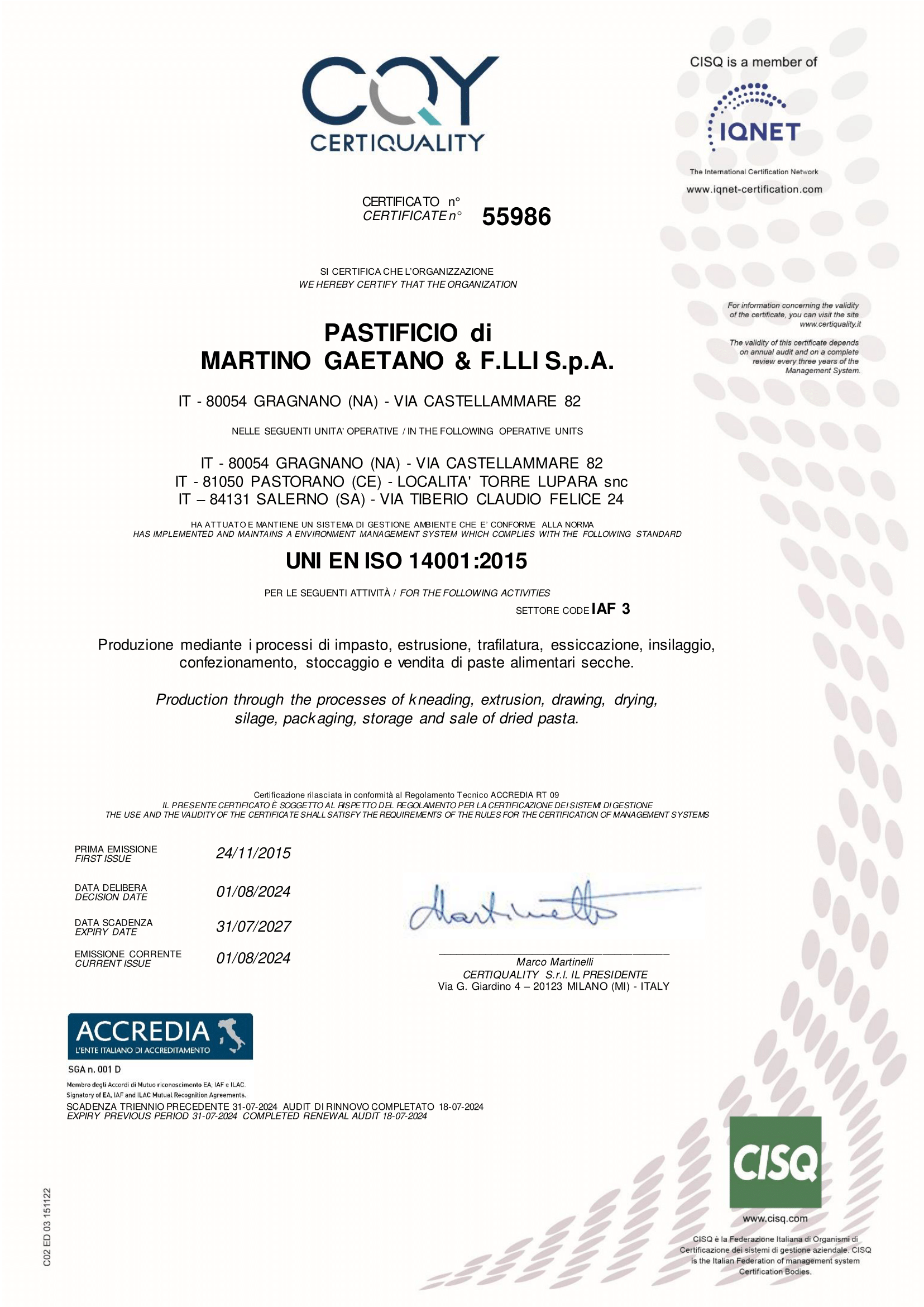 Al Pastificio Di Martino la qualità non è solo una promessa: è una responsabilità che ci assumiamo ogni giorno nei confronti dei nostri clienti, della loro salute, delle normative internazionali e delle diverse sensibilità culturali e religiose. Siamo orgogliosi di disporre di certificazioni riconosciute a livello internazionale, che attestano il nostro impegno per la sicurezza alimentare, la tracciabilità, la sostenibilità e la qualità del prodotto.