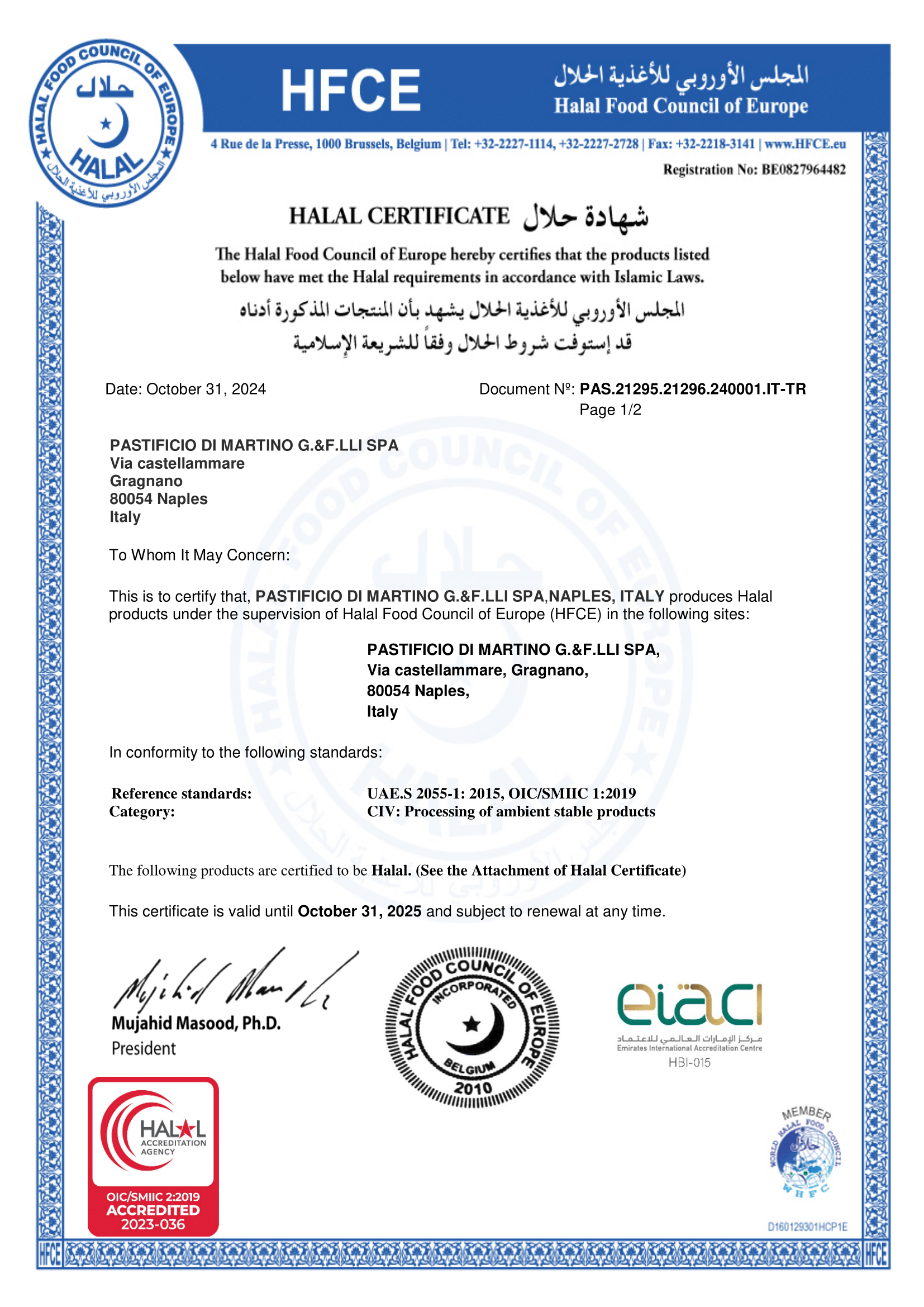 Non ci limitiamo a rispettare le normative: prestiamo massima attenzione anche alle esigenze culturali e religiose dei nostri consumatori, affinché tutti possano gustare la nostra pasta con serenità e fiducia. Nell'impegno quotidiano per garantire la massima sicurezza e trasparenza dei suoi prodotti, il Pastificio Di Martino ha scelto, infatti, di ottenere anche la certificazione Halal. Crediamo che il cibo debba unire e rispettare ogni cultura: per questo motivo la nostra linea certificata Halal è prodotta nel pieno rispetto dei precetti religiosi, senza compromessi sulla qualità che da sempre contraddistingue la nostra pasta.