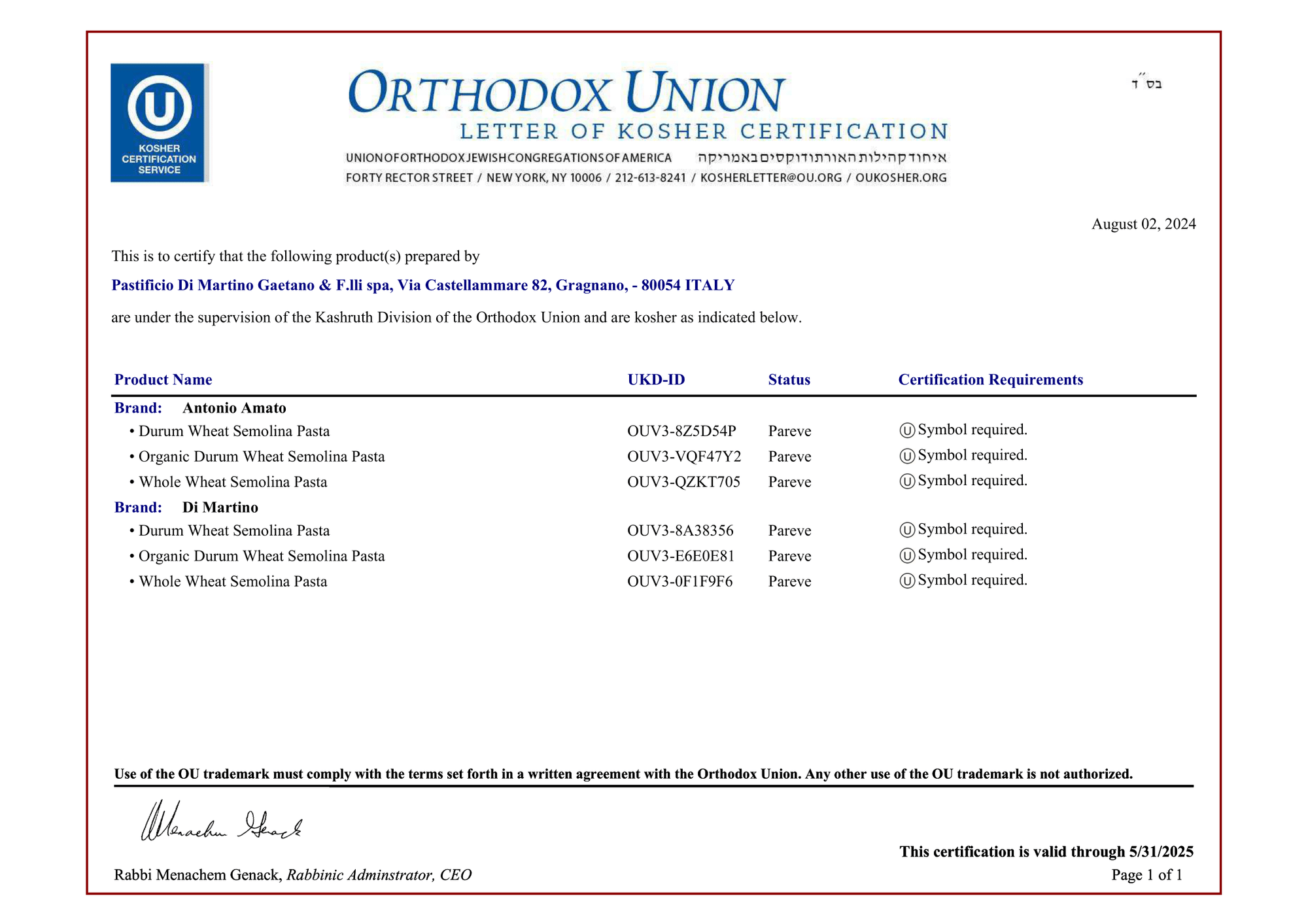 Allo stesso modo, abbiamo ottenuto anche la certificazione Kosher, per rispondere alle esigenze della comunità ebraica. La nostra linea Kosher rispetta rigorosamente le regole alimentari previste dalla tradizione ebraica, mantenendo al contempo l’eccellenza qualitativa che ci rappresenta. Con questa scelta, ribadiamo il nostro impegno a rendere la Pasta Di Martino un alimento inclusivo, capace di valorizzare la diversità e favorire l’incontro tra culture.